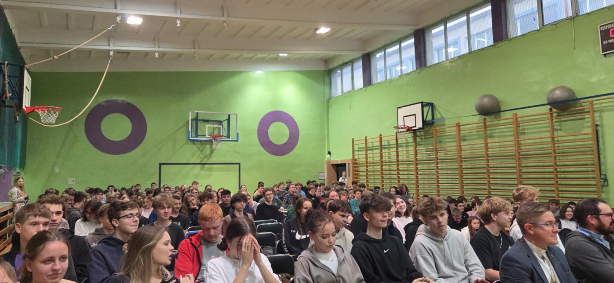 Wydarzenie obserwowała licznie zgromadzona publiczność, złożona z uczniów klas o profilu humanistycznym, nauczycieli oraz dyrekcji.